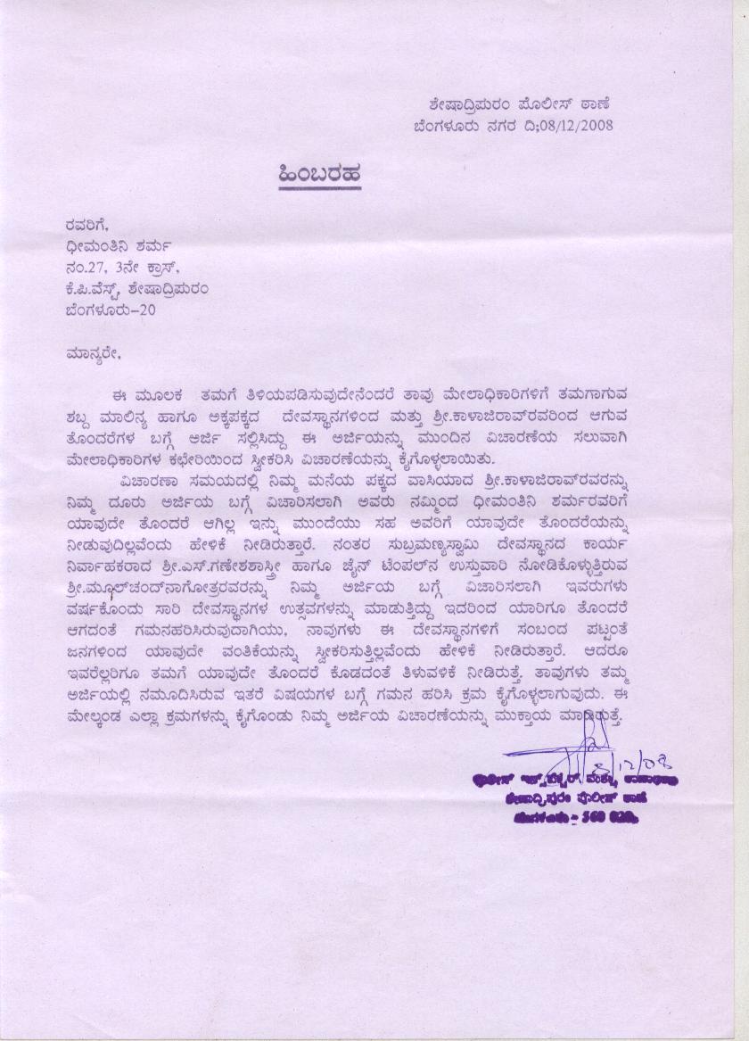 Finally they placed a complaint in the Seshadripuram police station that we had